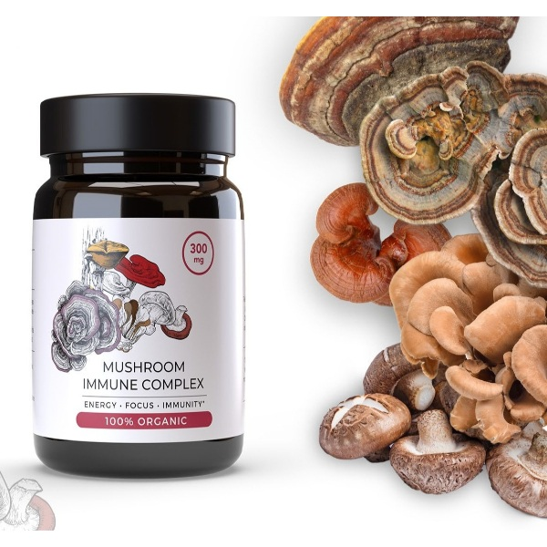 An ultimate Immune Complex Mushroom Supplement—a meticulously crafted blend of nature’s potent defenders.