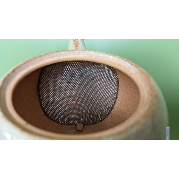 This terracotta teapot is enhanced with a glaze that shifts between light green and gray; through the glaze, the natural terracotta layers remain visible. Made in Tokoname, central Japan, and handcrafted; glaze variations may differ slightly from the photo.