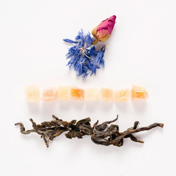 Ingredients: Li Zi Xiang green tea, mint, mango, papaya, cornflower, rosebuds, white karkadè buds.