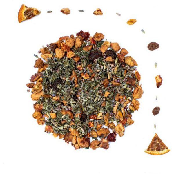 Ingredients: Lavender flowers, orange peel, apple, raisin, heather, blackberry leaves, lavender essential oil, and orange essential oil.