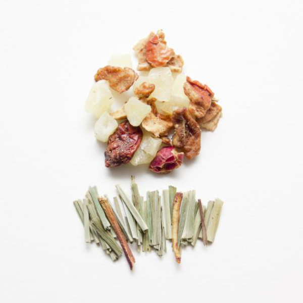 Ingredients: Apple, candied pineapple (pineapple and sugar), raisins, gooseberries, lemongrass, freeze-dried strawberries, lemon (with glucose syrup), thickener, natural flavors, lime peels.