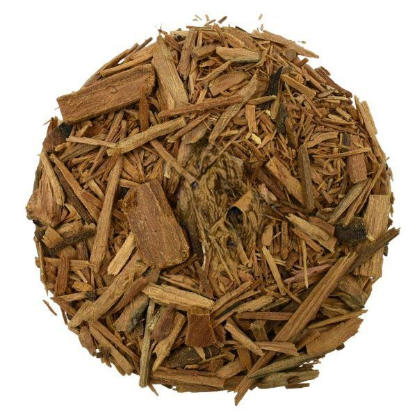 Cut Santalum album bark with sweet warm woody aroma ideal for fragrant aromatic herbal blends.
