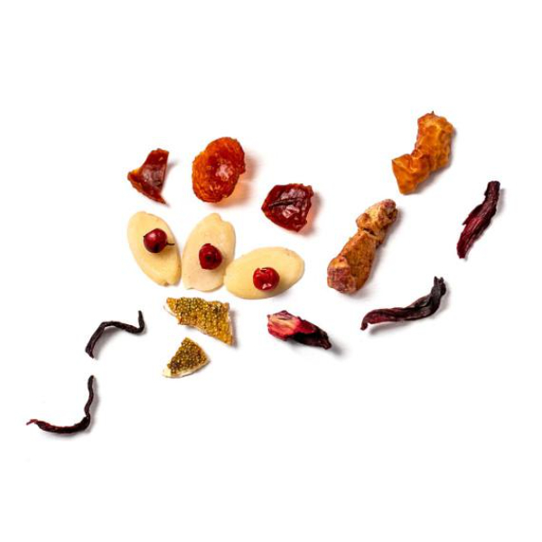 Ingredients: Apple, hibiscus, orange peel, rosehip, almonds, pink peppercorn, cinnamon, and natural orange flavor.
